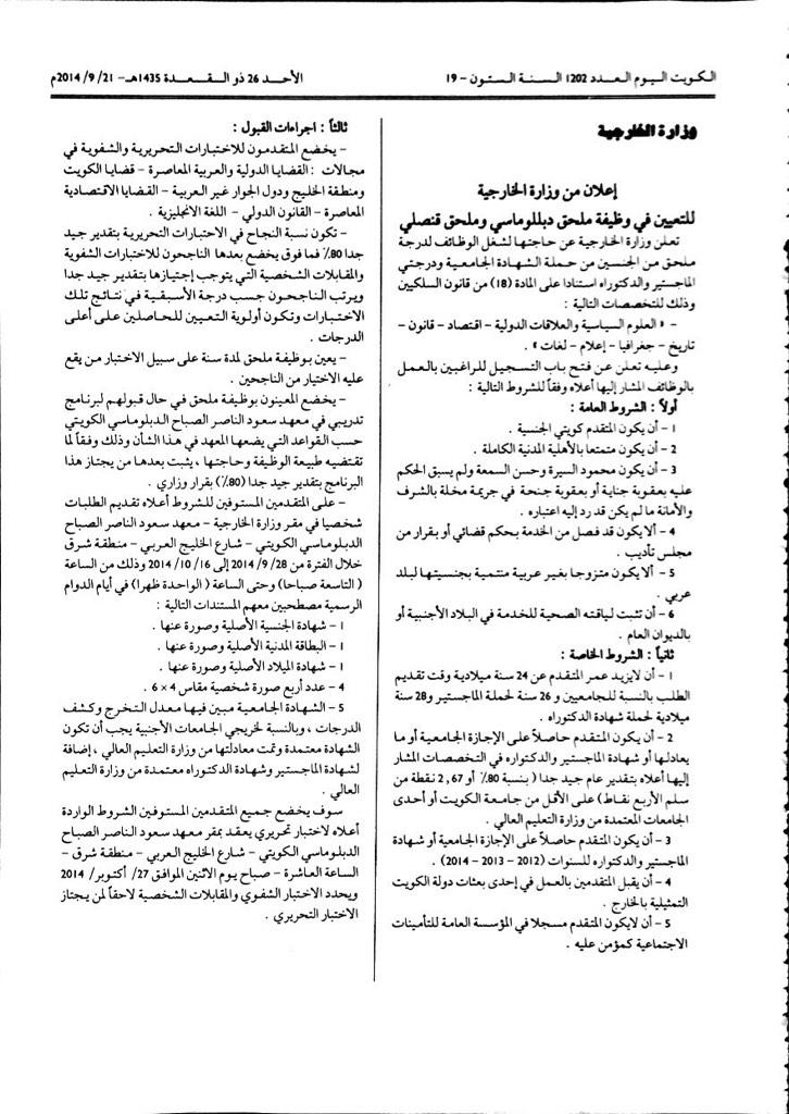 وظائف شاغرة فى وزارة الخارجية الكويتية لسنة 2020