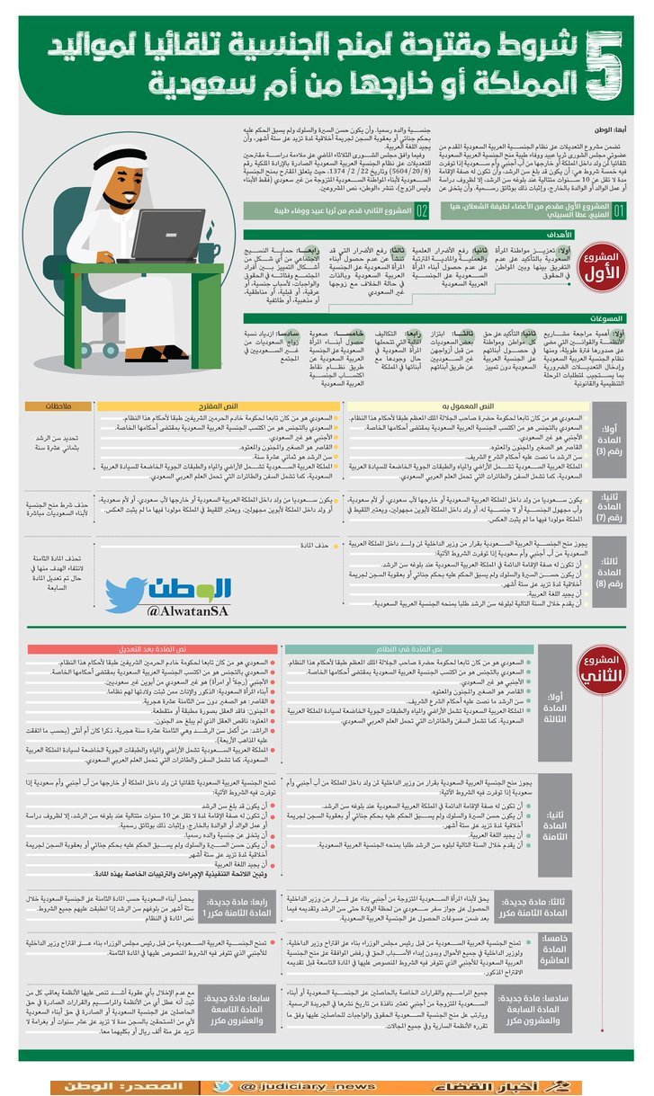 أخبار القضاء Twitterissa مشروع التعديلات على نظام الجنسية السعودية المقدم من عضوتي مجلس الشورى ثريا عبيد ووفاء طيبة يقترح منح الجنسية تلقائيا لمن ولد داخل المملكة أو خارجها من أب أجنبي وأم