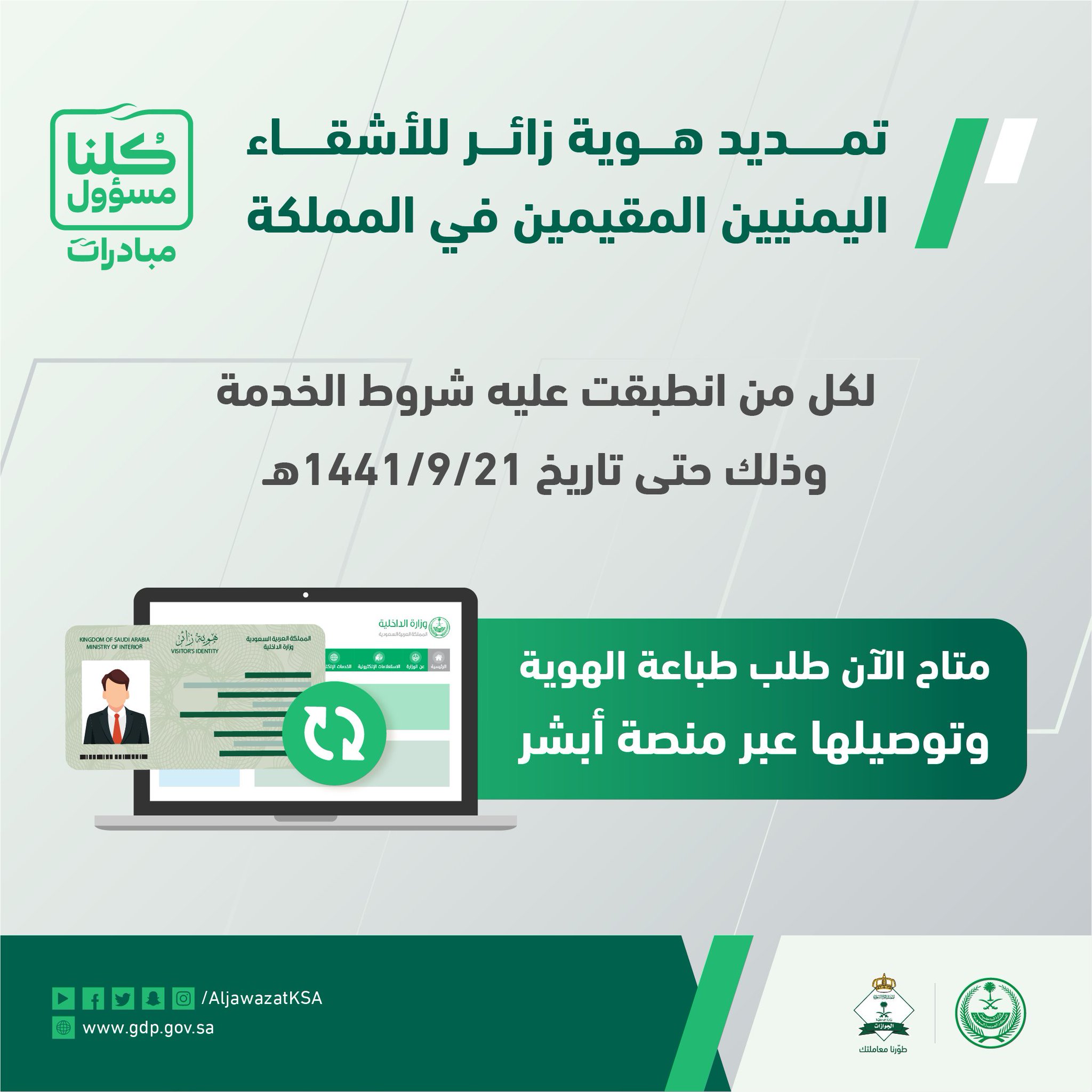 الجوازات السعودية On Twitter الجوازات تتيح خدمة طلب طباعة هوية زائر وتوصيلها عبر منصة أبشر للأشقاء اليمنيين المقيمين في المملكة ممن تم تمديد الهوية لهم حتى تاريخ 1441 9 21 هـ الجوازات في خدمتكم كلنا مسؤول Https T Co W2jdies0tn